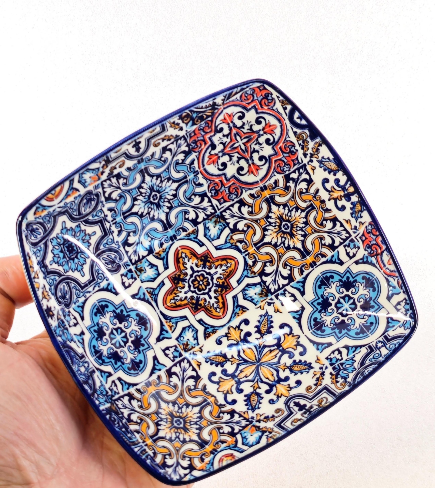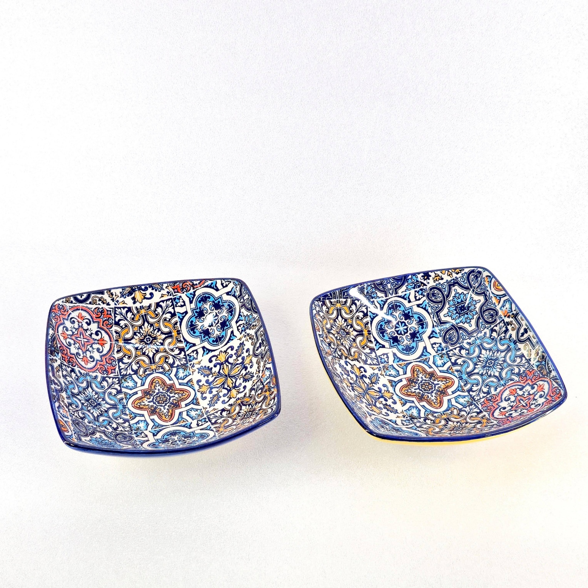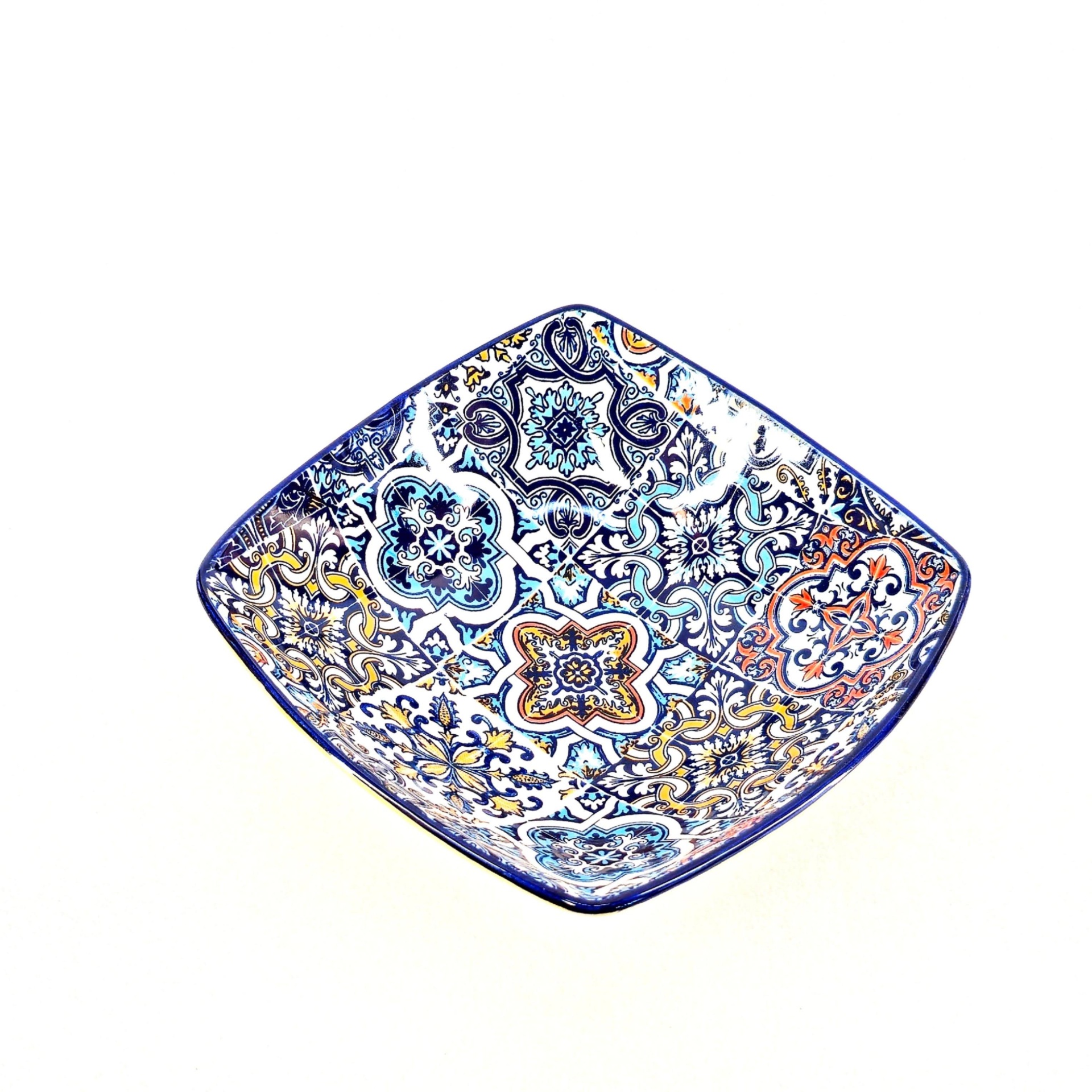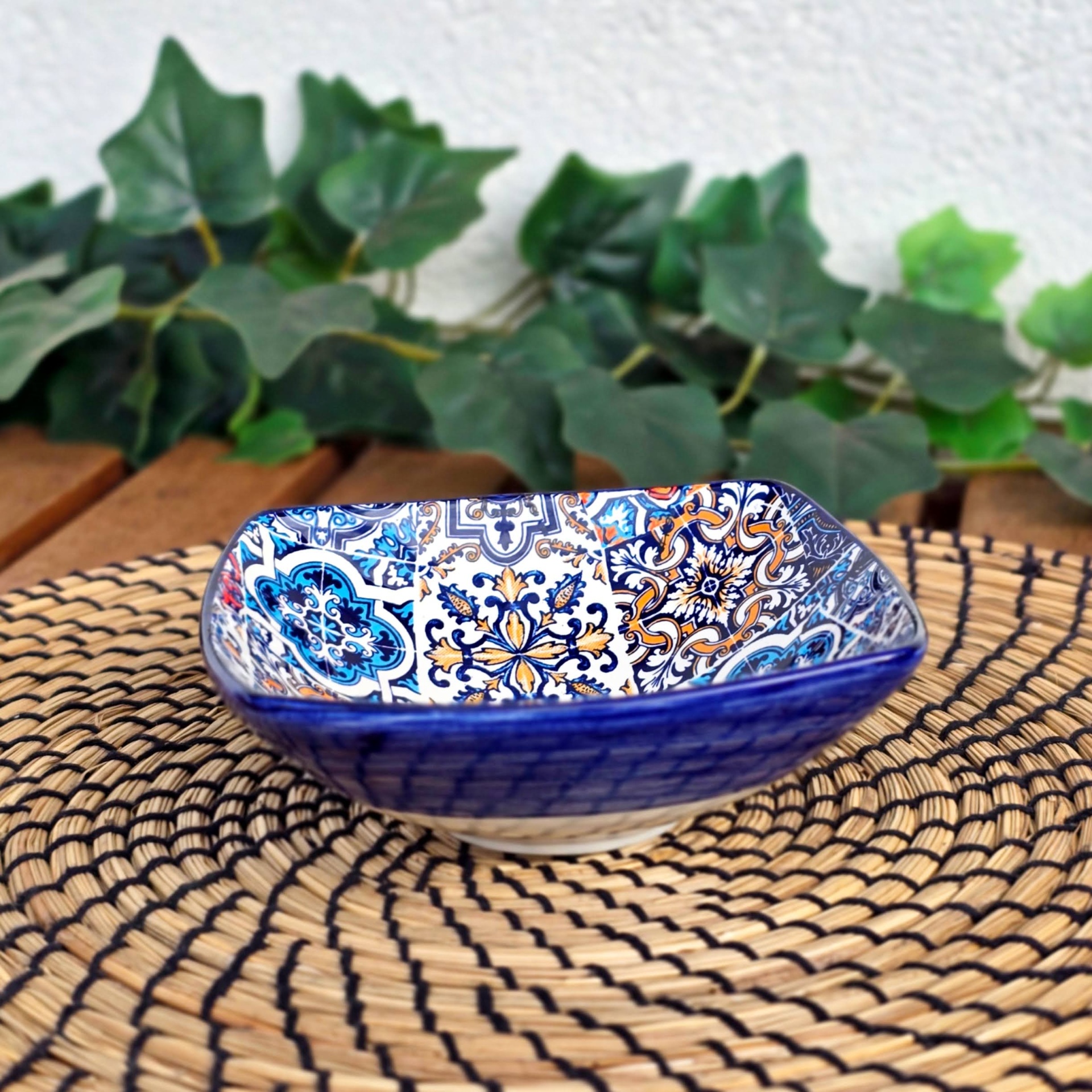 Louça de cerâmica de Alcobaça da Coleção Azulejos - AlcoArt, produzida com técnicas artesanais tradicionais e com um design que combina a tradição portuguesa com um estilo comtemporâneo. Cada peça apresenta um acabamento distinto e expressivo, com padrões e cores inspirados na cerâmica típica da região de Alcobaça, conferindo personalidade à sua mesa.