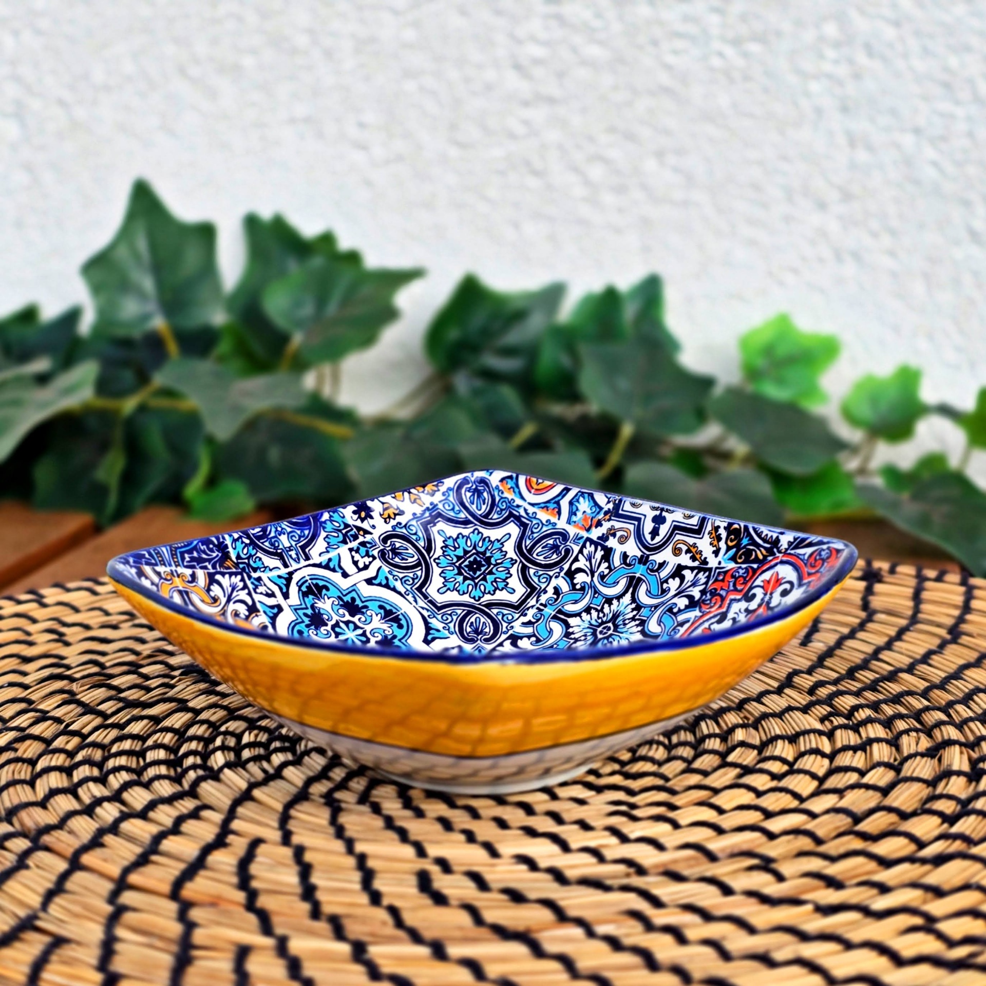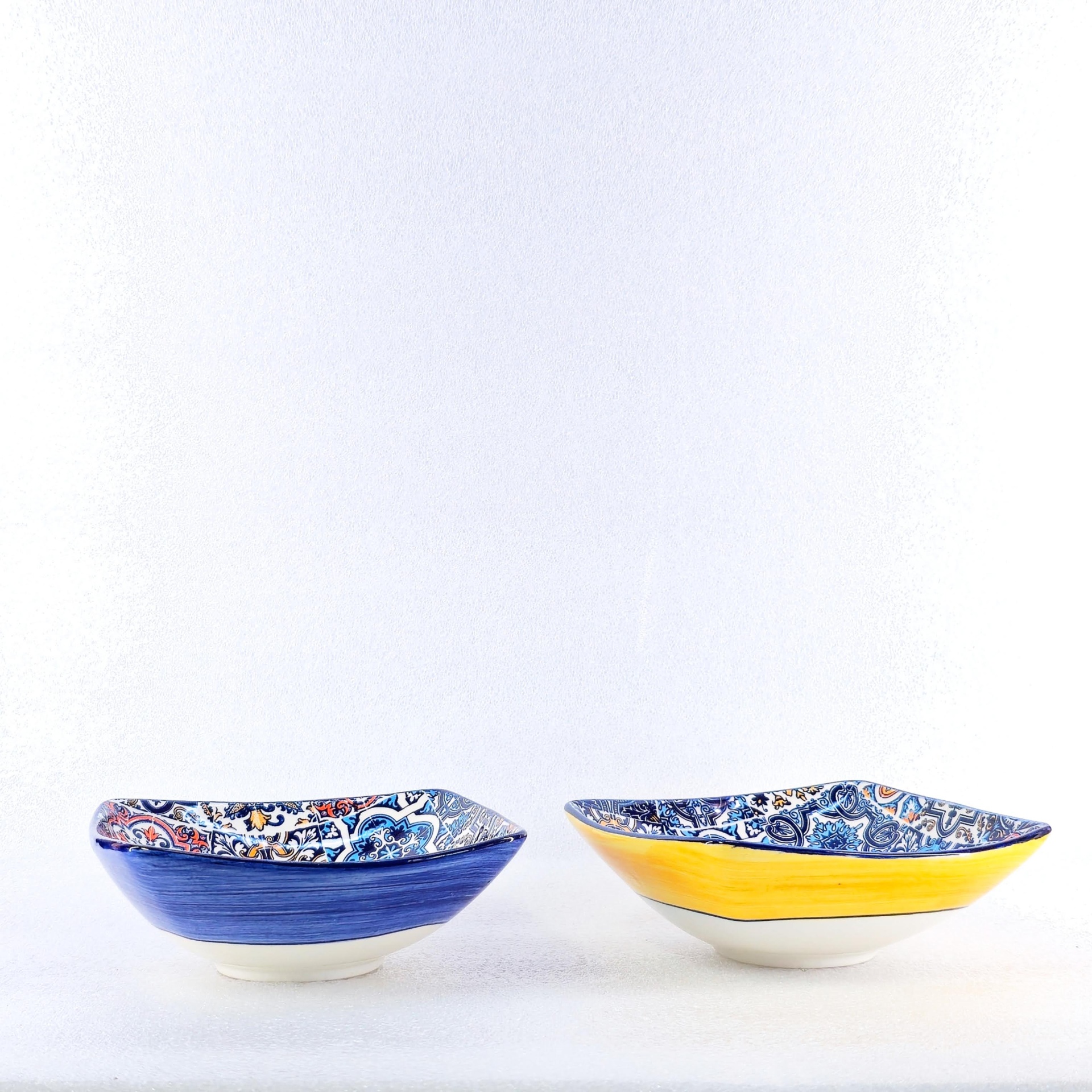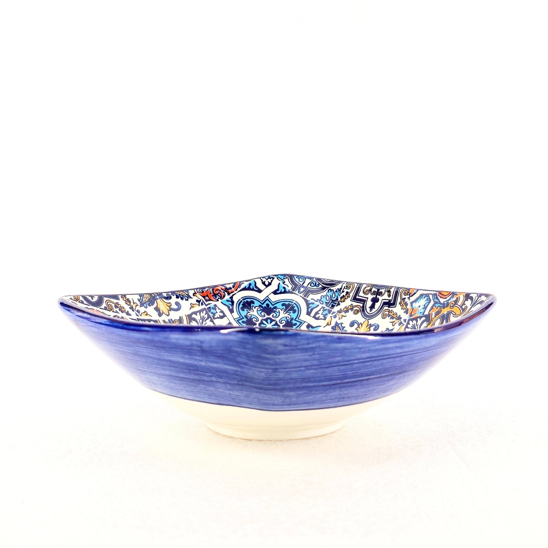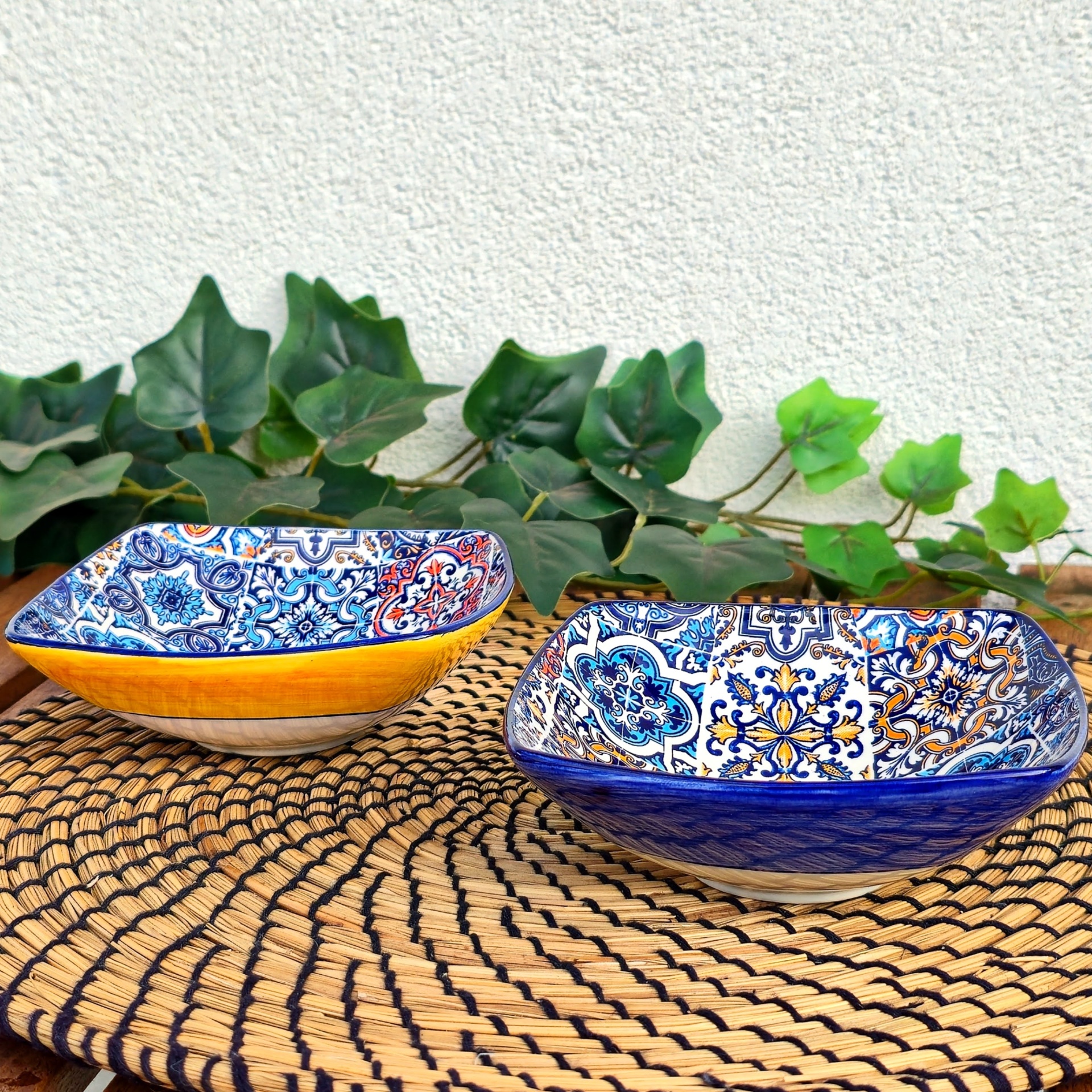 Louça de cerâmica de Alcobaça da Coleção Azulejos - AlcoArt, produzida com técnicas artesanais tradicionais e com um design que combina a tradição portuguesa com um estilo comtemporâneo. Cada peça apresenta um acabamento distinto e expressivo, com padrões e cores inspirados na cerâmica típica da região de Alcobaça, conferindo personalidade à sua mesa.