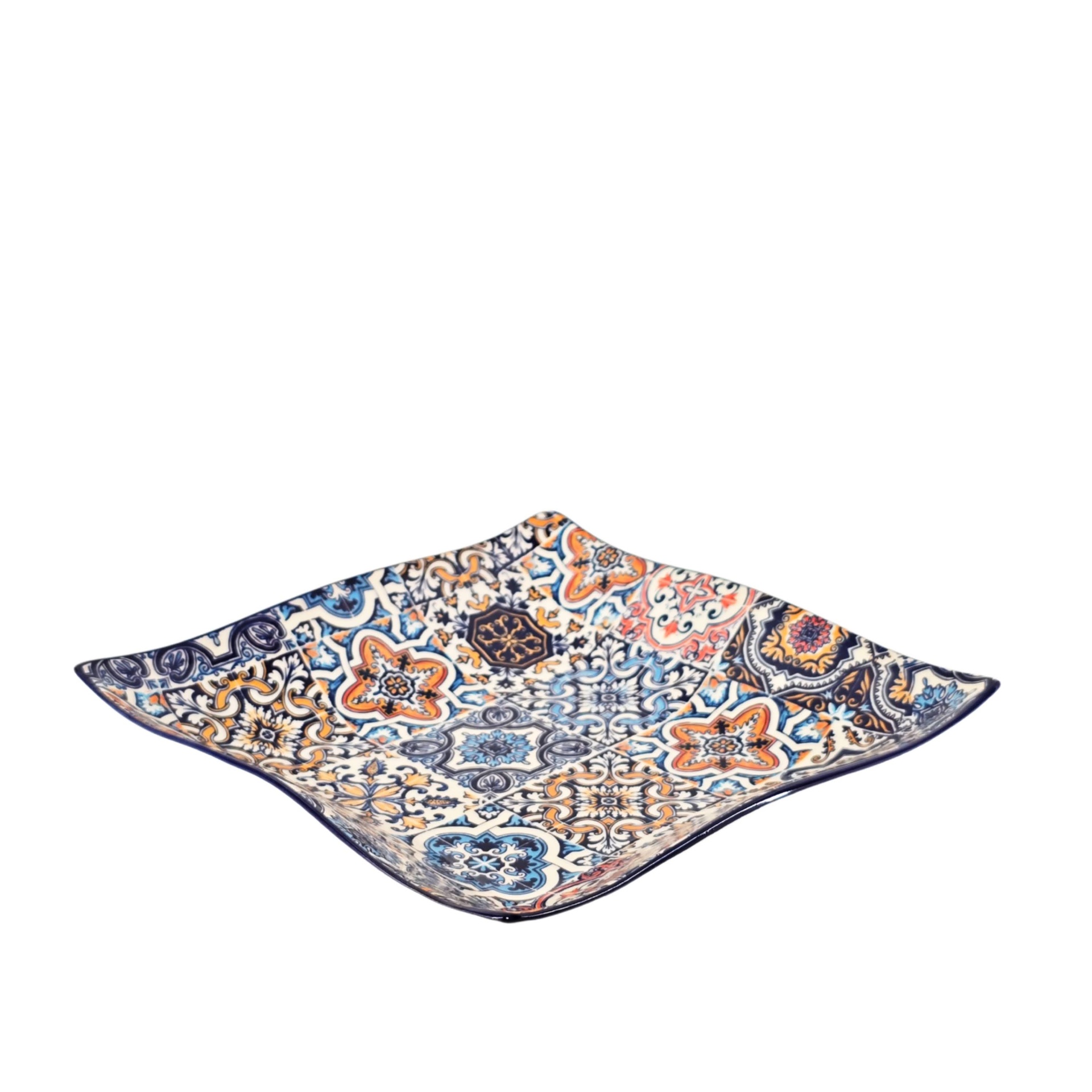 • Prato quadrado em cerâmica com padrões decorativos coloridos