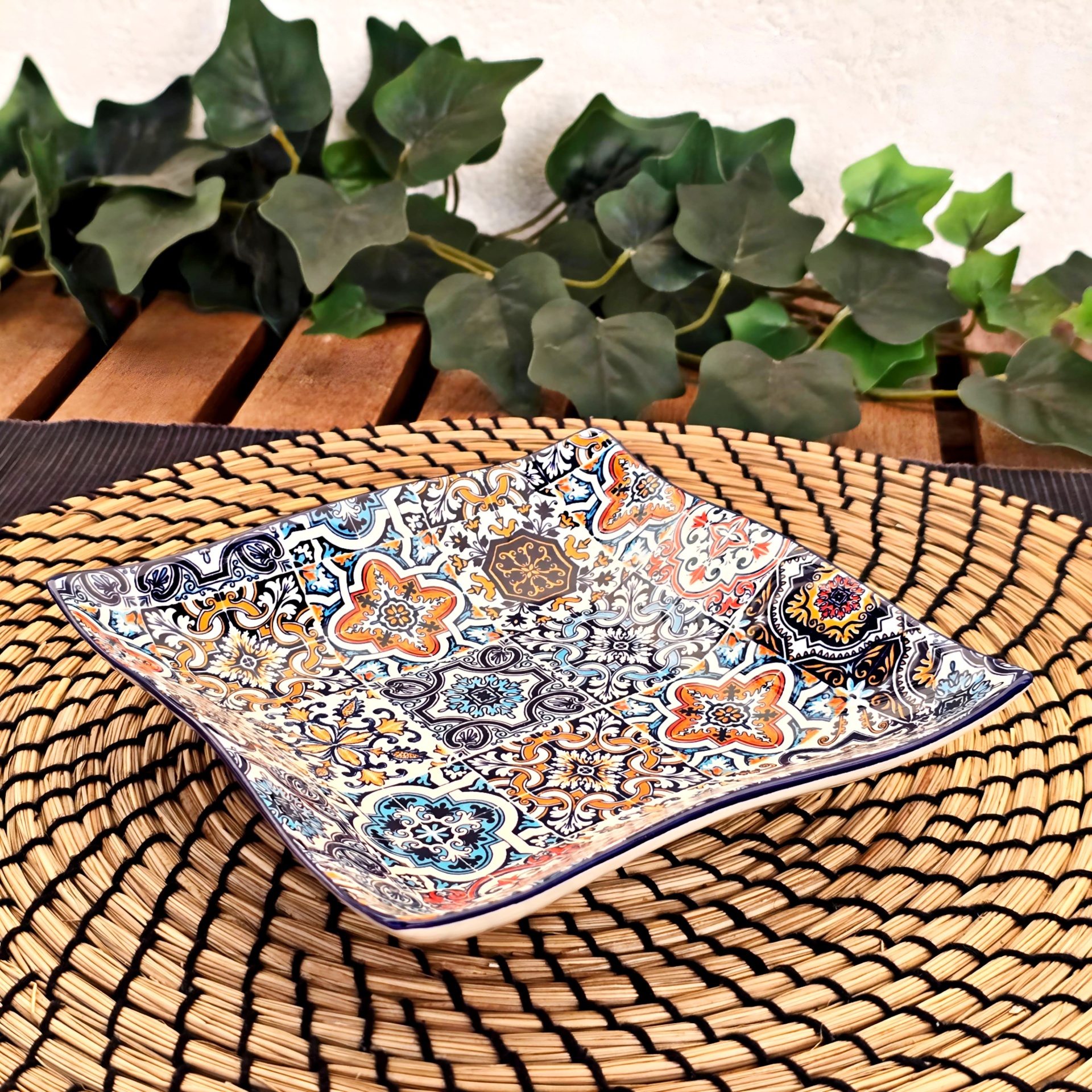 • Prato quadrado decorativo em cerâmica com padrão colorido sobre base de palha trançada