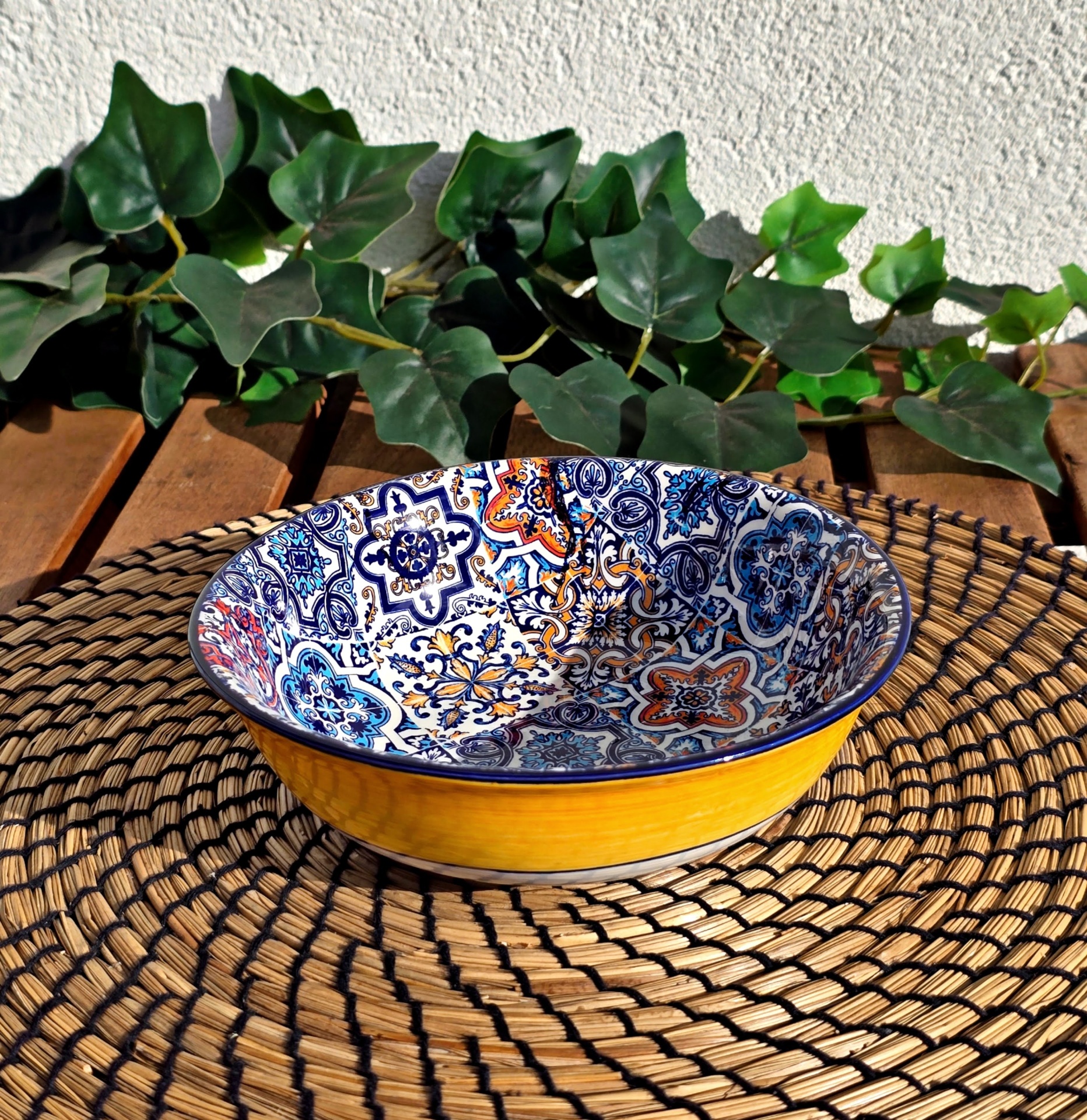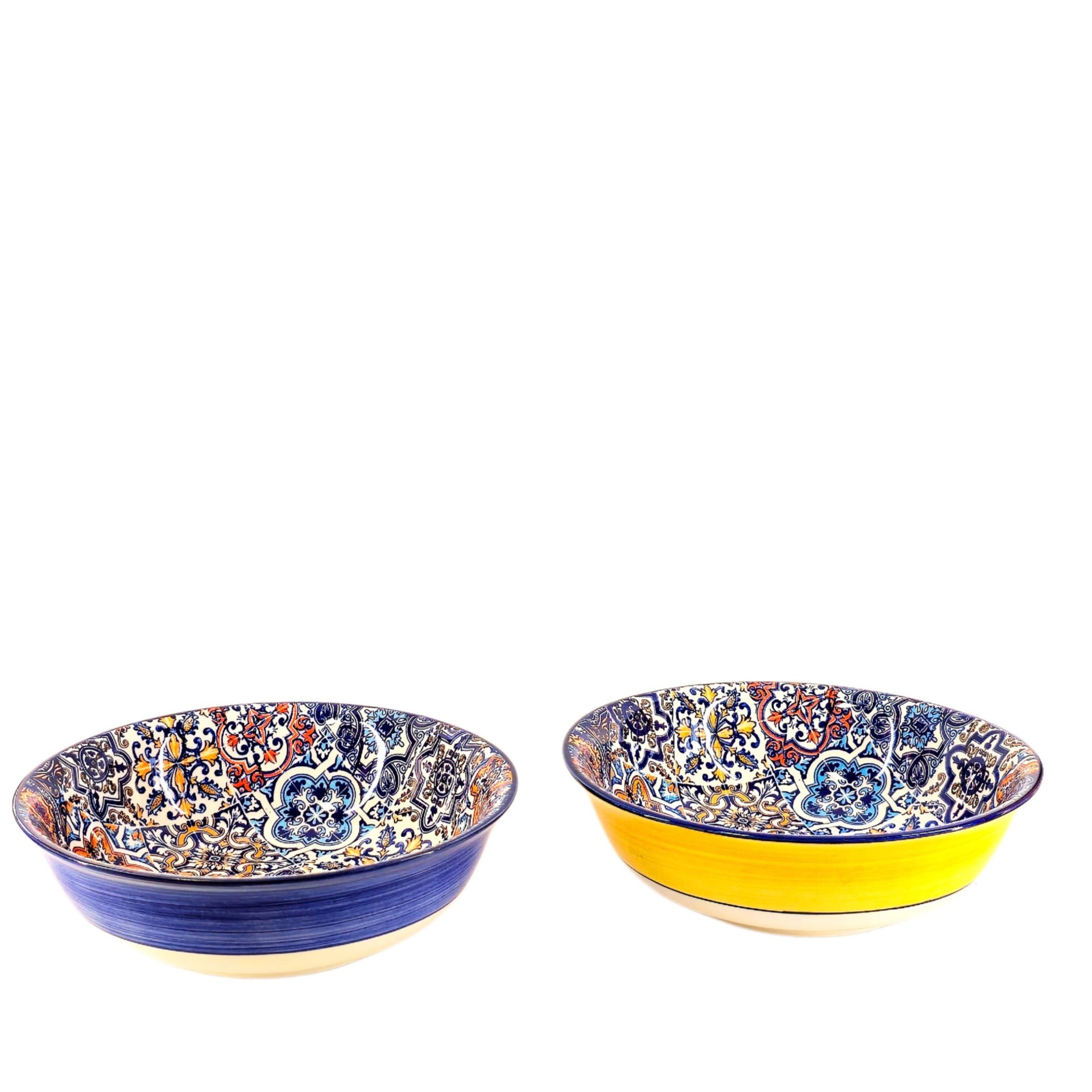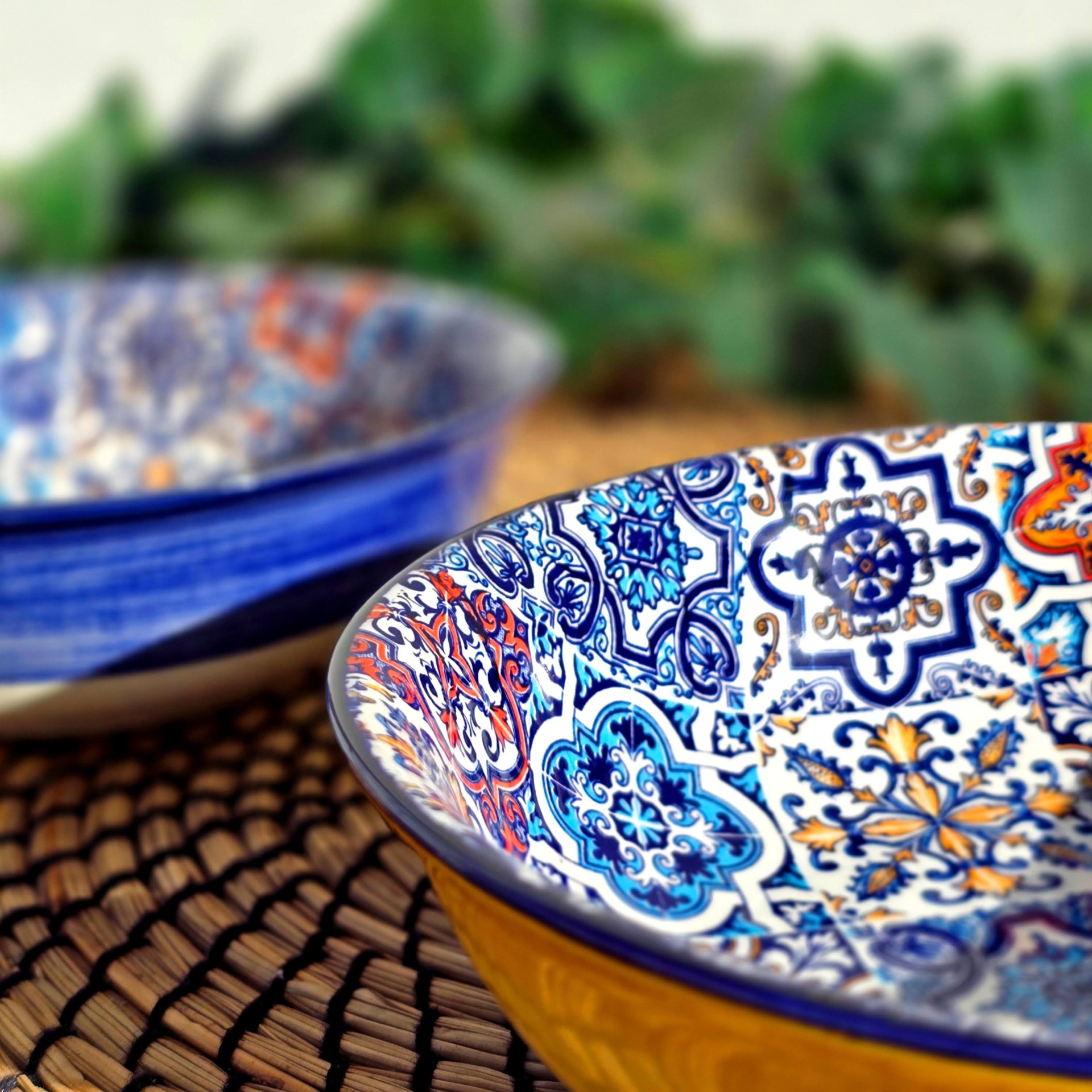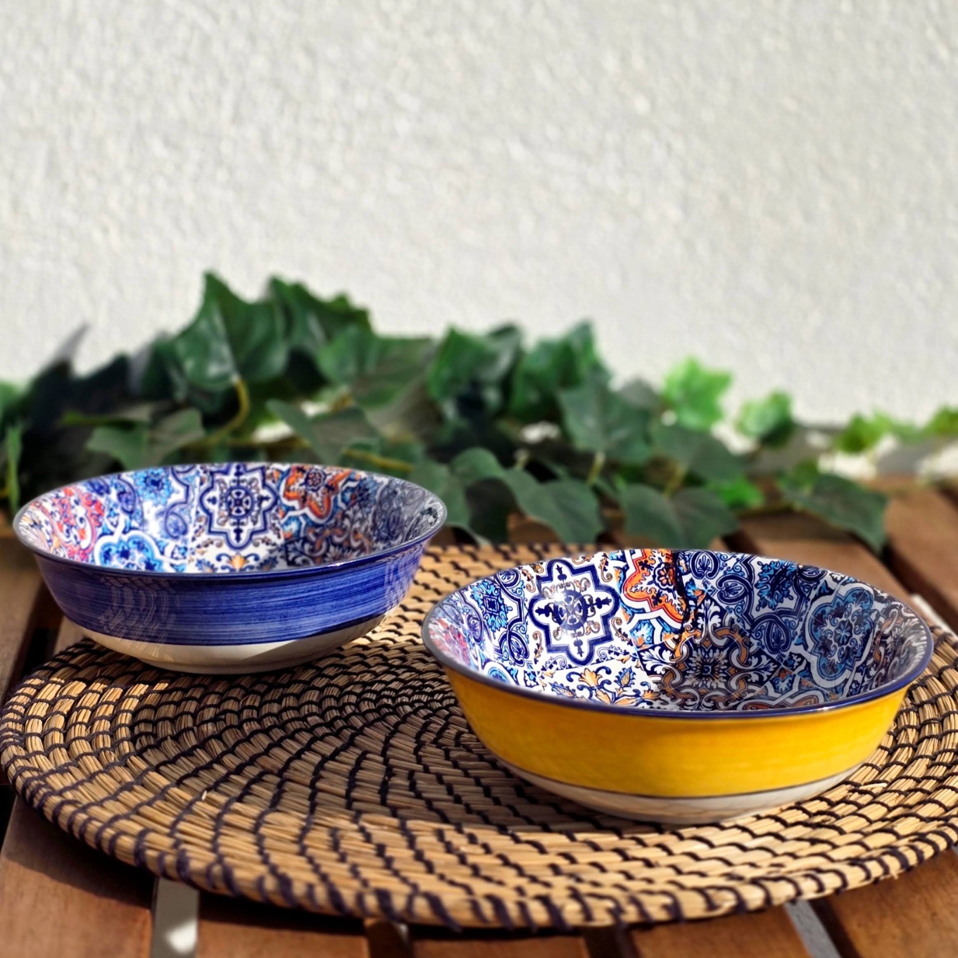 • Dois pratos fundos em cerâmica com padrões azuis e amarelos sobre tapete de fibra numa mesa de madeira