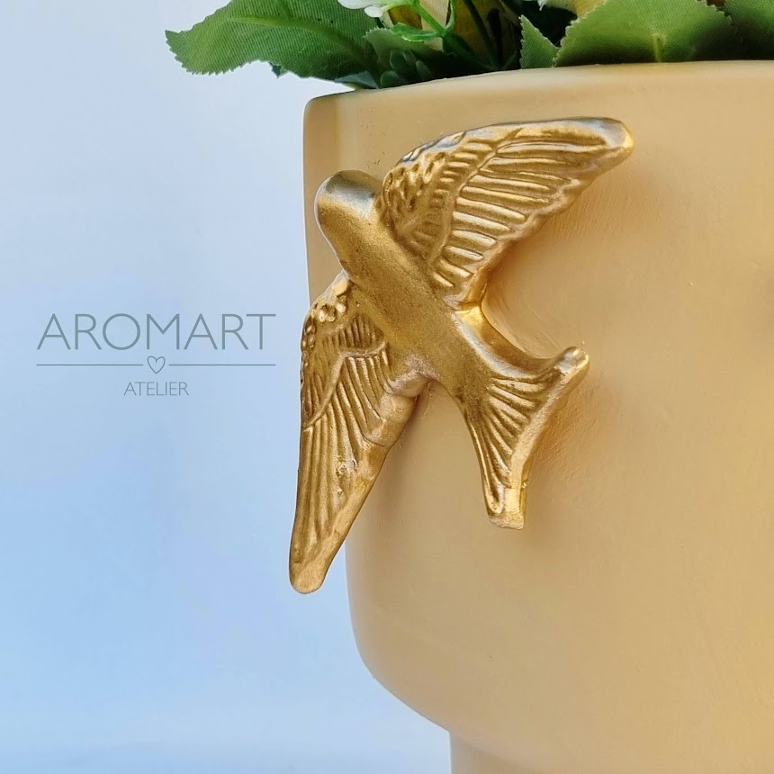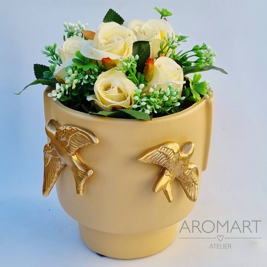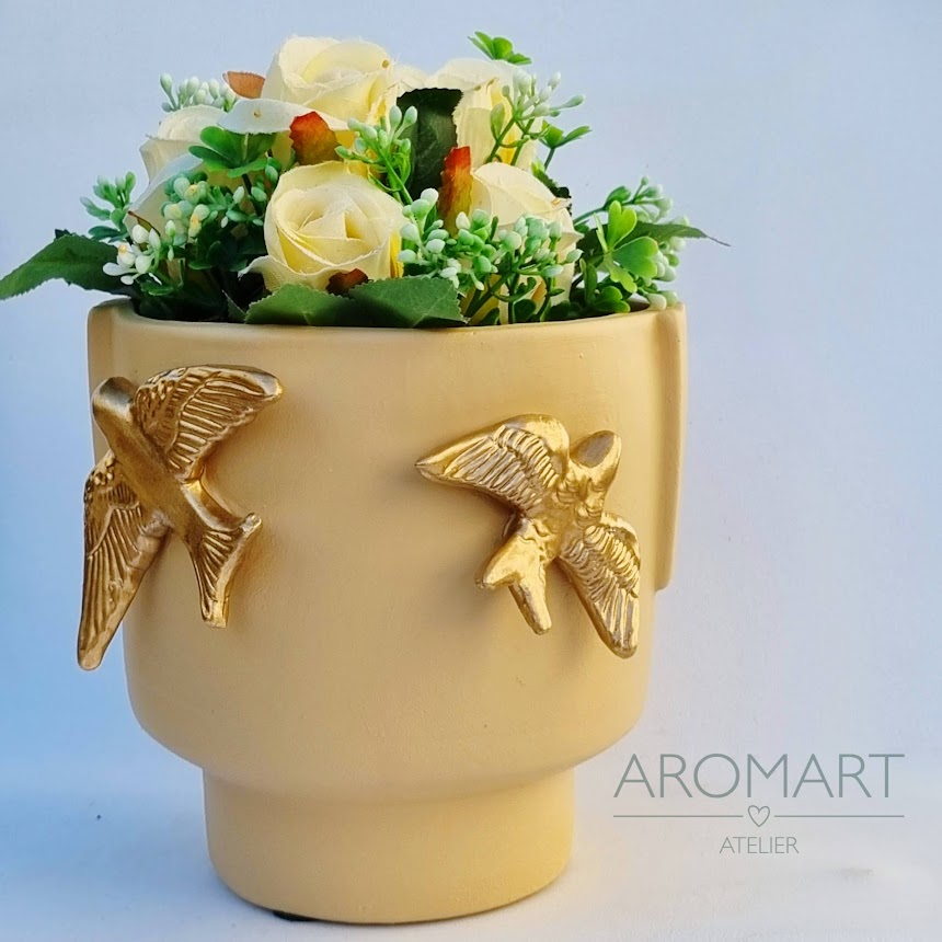 • Vaso bege com pássaro dourado e plantas verdes, texto 'AROMART ATELIER'