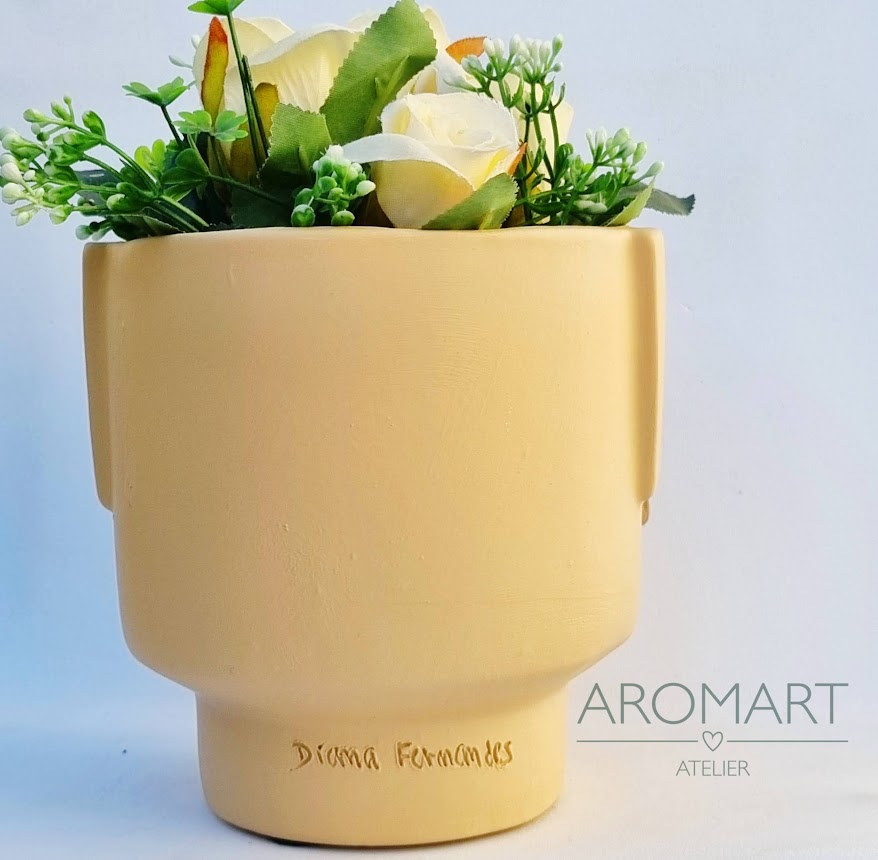 • Vaso de cerâmica amarelo claro com flores artificiais e texto AROMART ATELIER