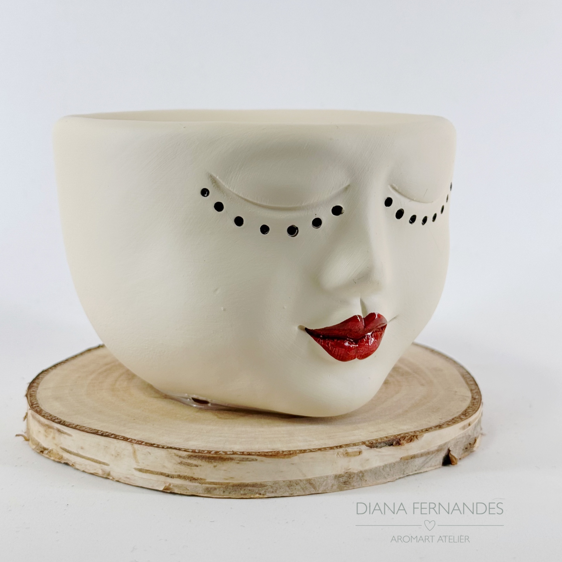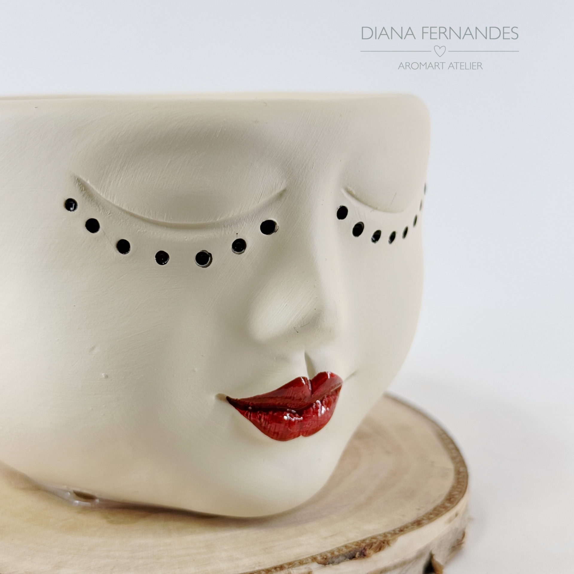 • Vaso cerâmica rosto branco com olhos fechados e lábios vermelhos sobre base de madeira