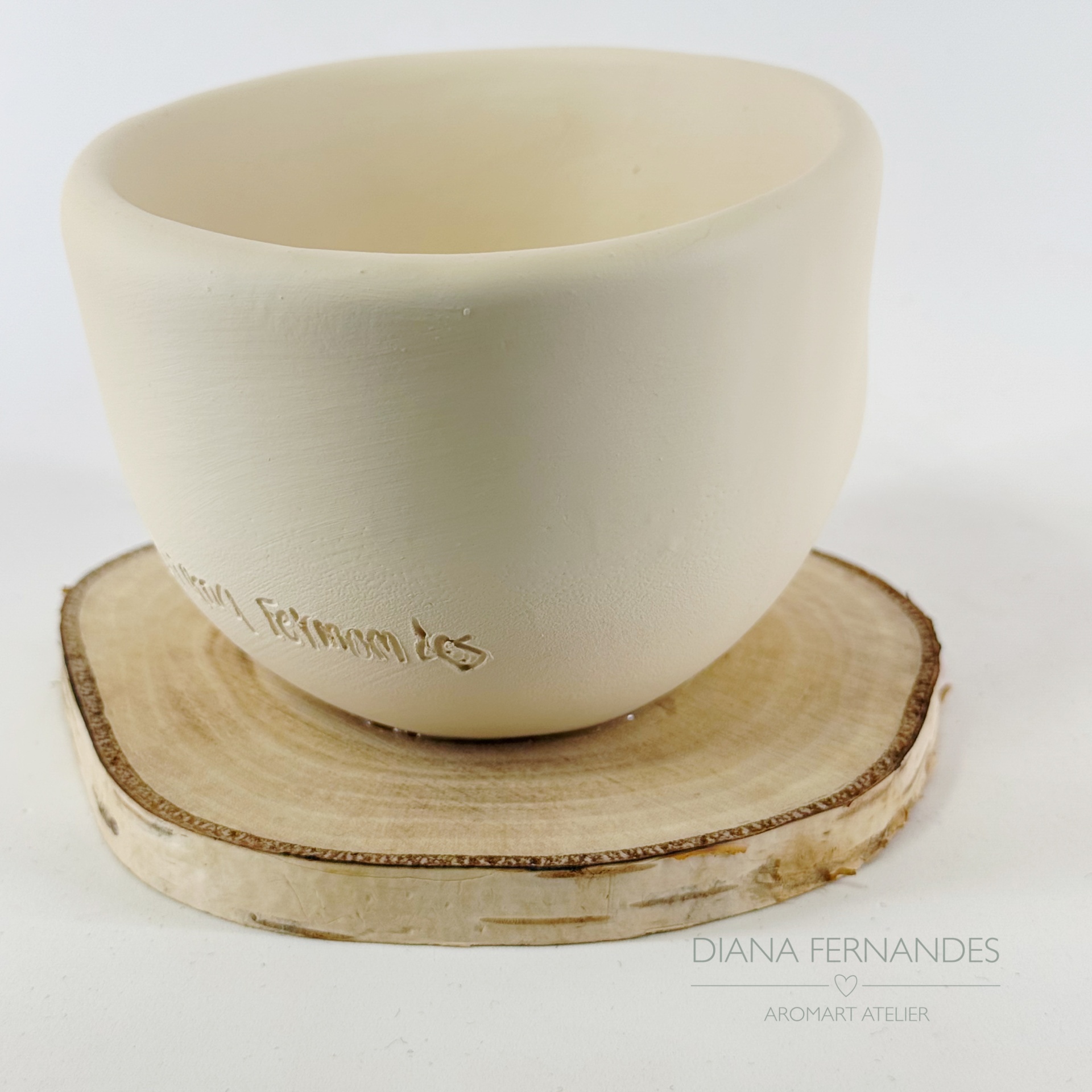 • Vaso de cerâmica branca sobre base de madeira