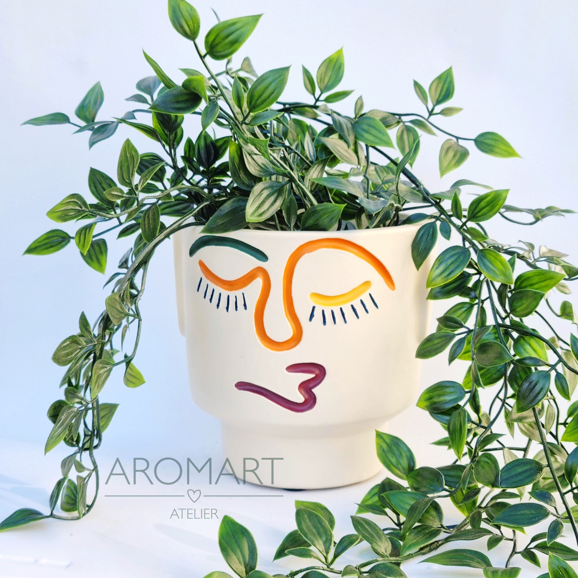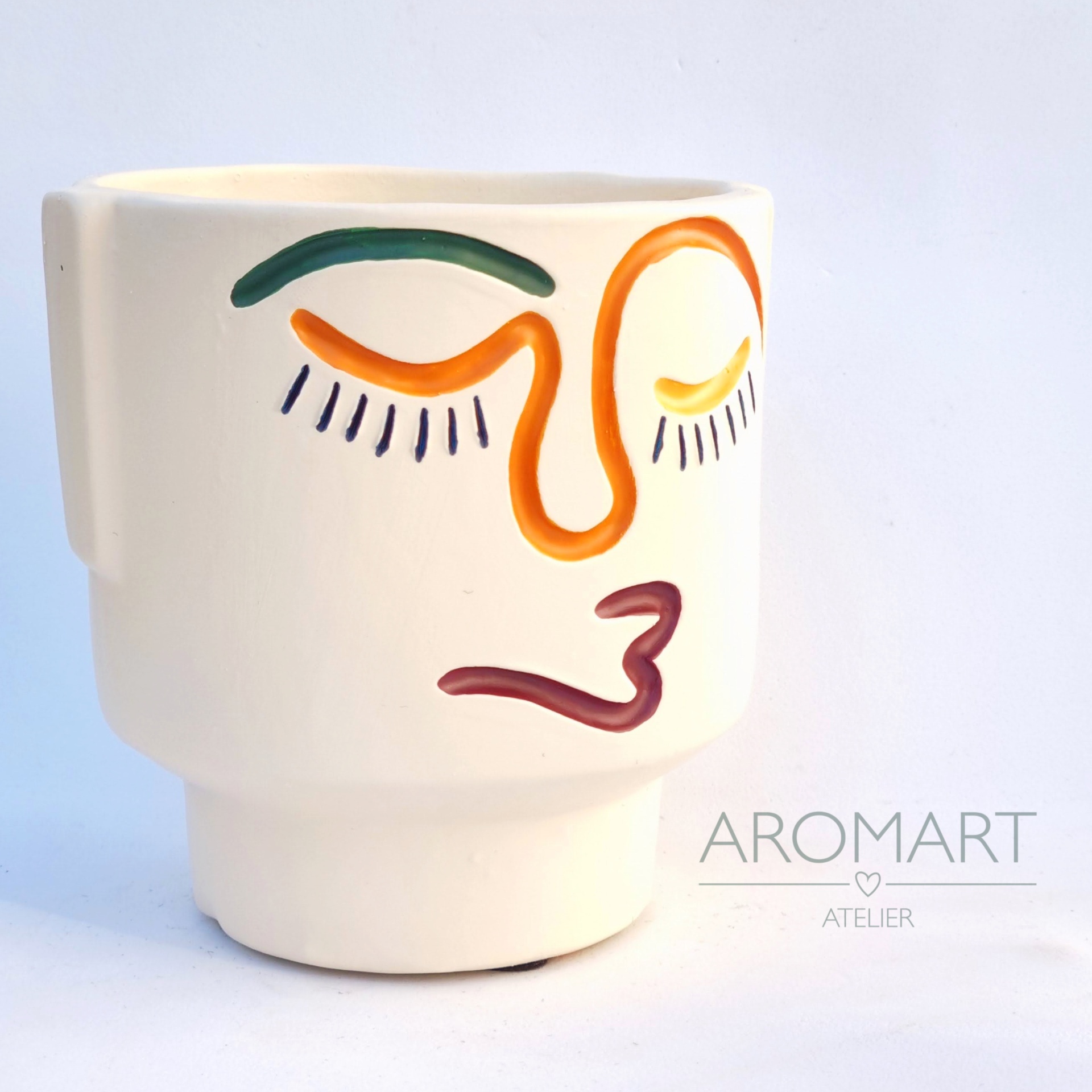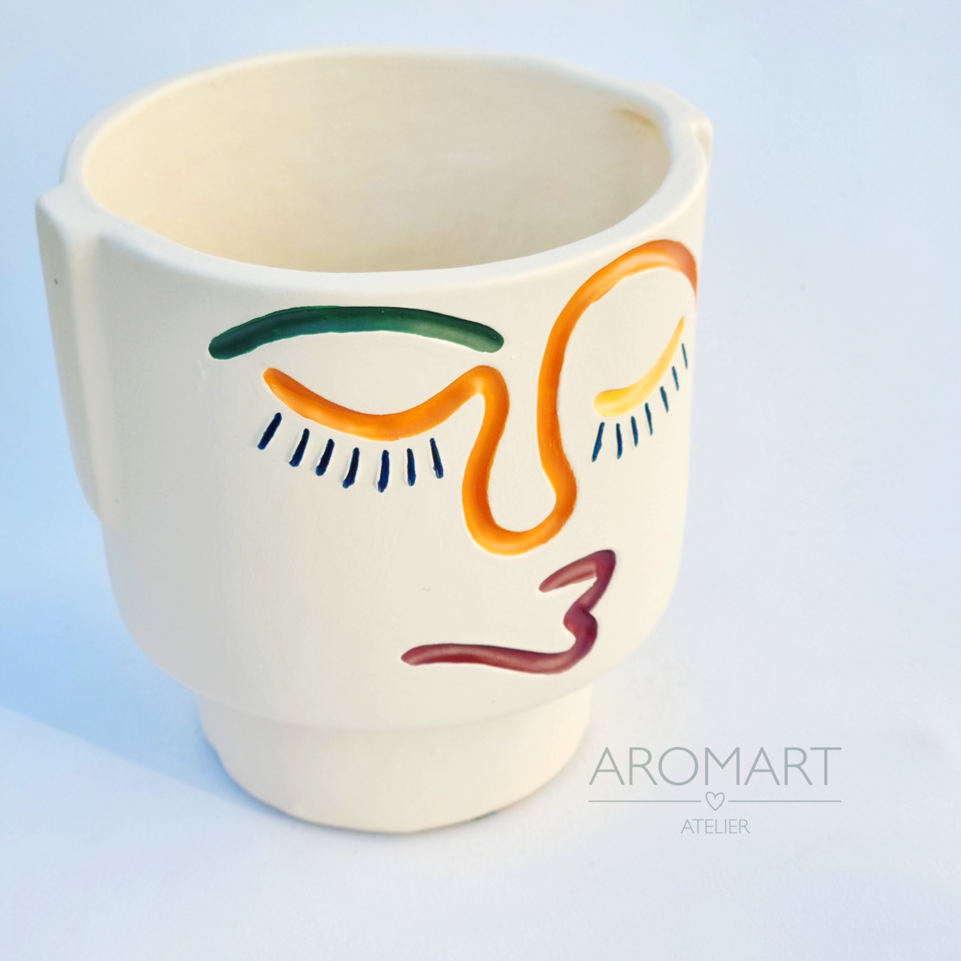 • Vaso de cerâmica branco com rosto colorido e texto AROMART ATELIER