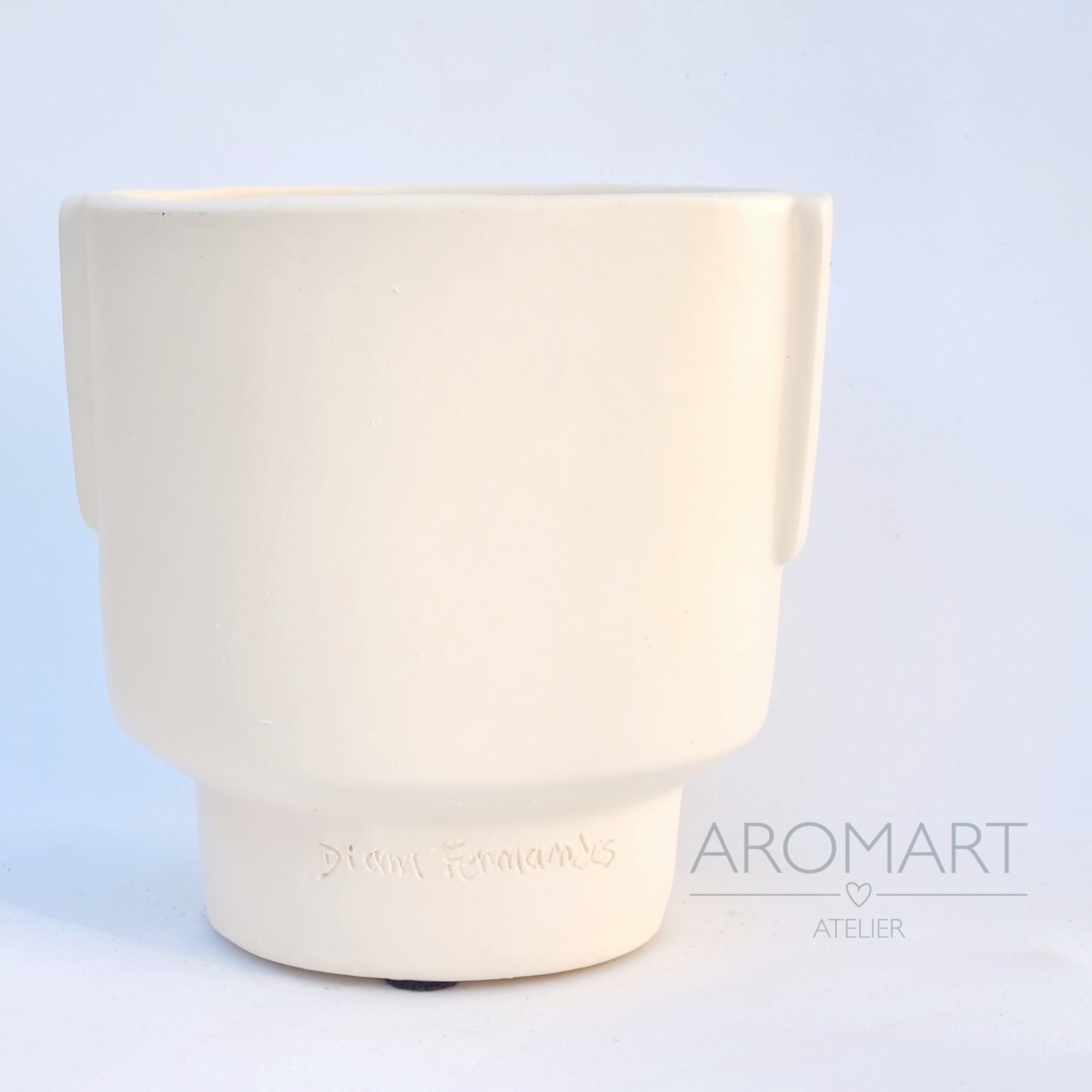 • Vaso de cerâmica branco com texto gravado e logo AROMART ATELIER