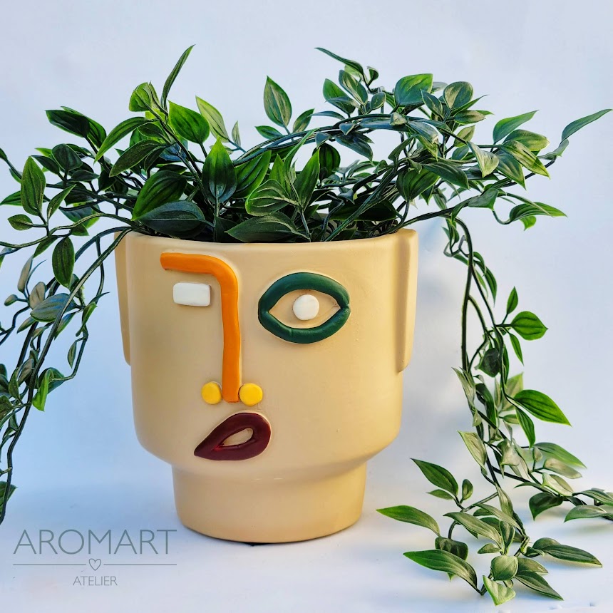 • Vaso de cerâmica bege com rosto abstrato colorido e planta artificial verde