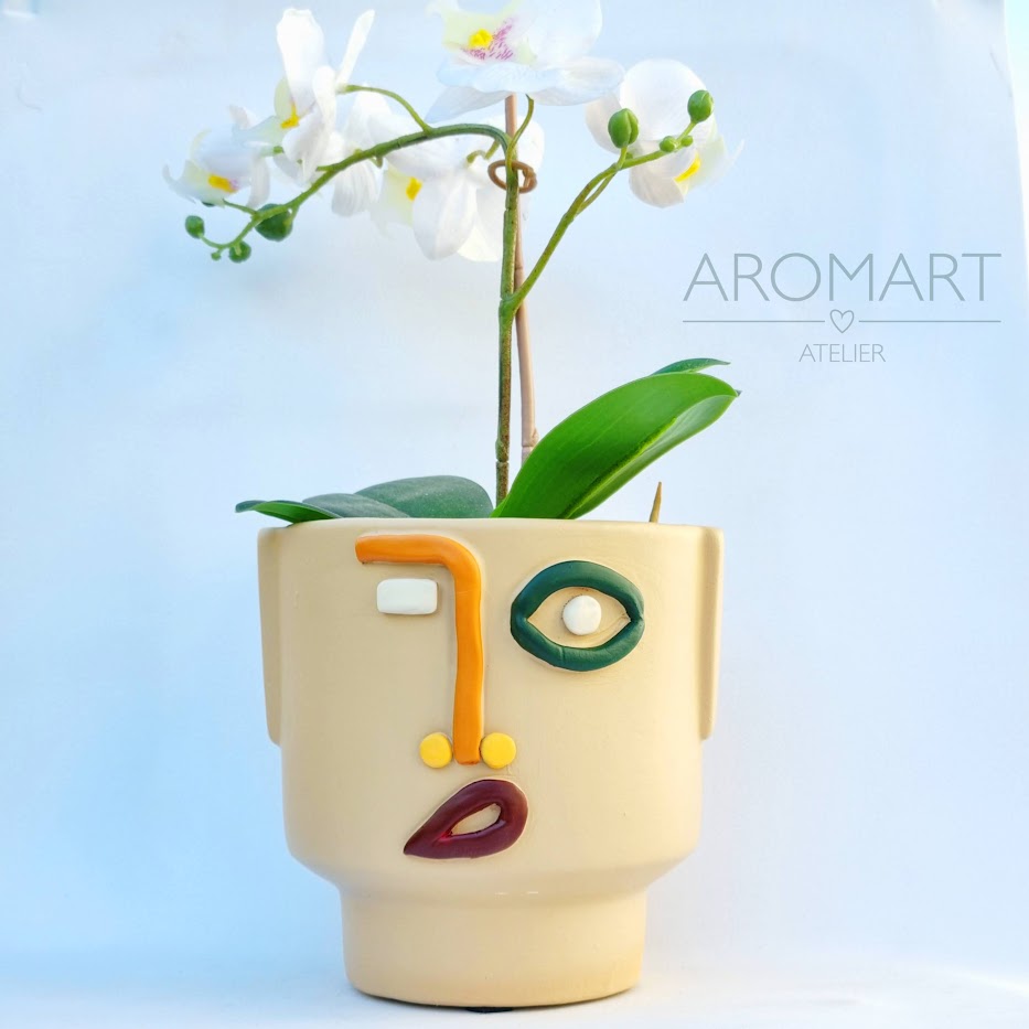 • vaso em cerâmica com rosto abstrato e planta orquídea branca