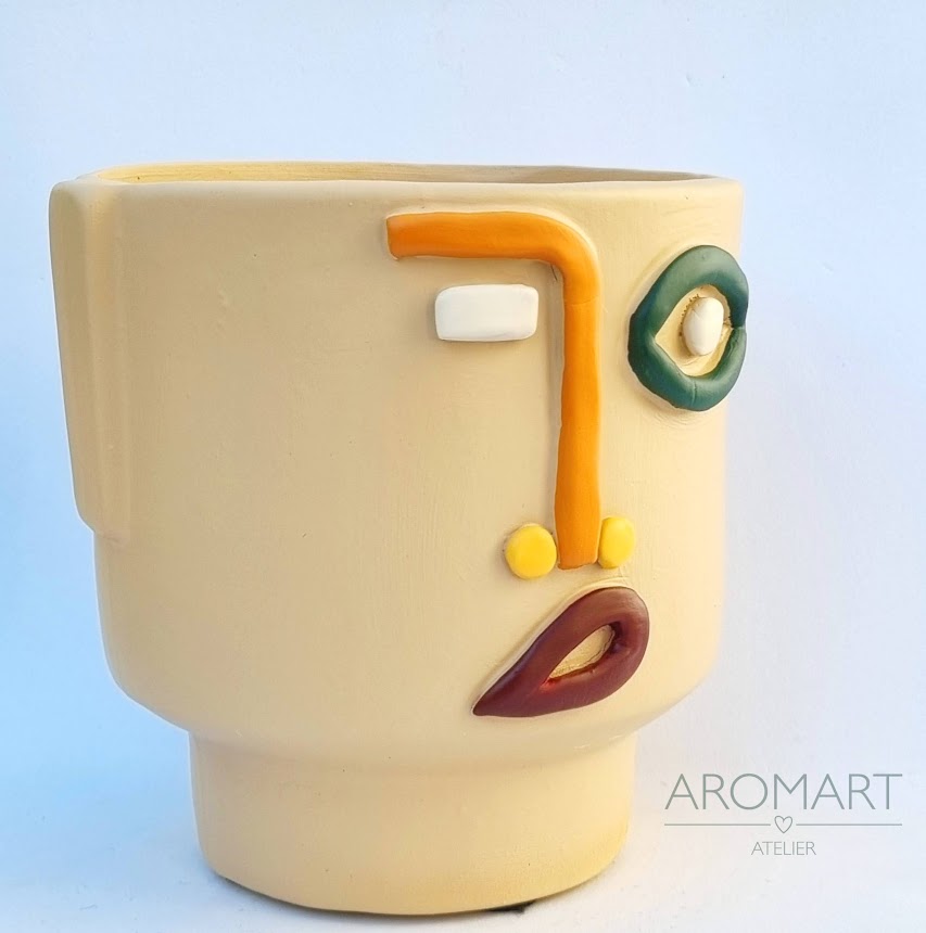 • Vaso em cerâmica bege com rosto colorido em relevo