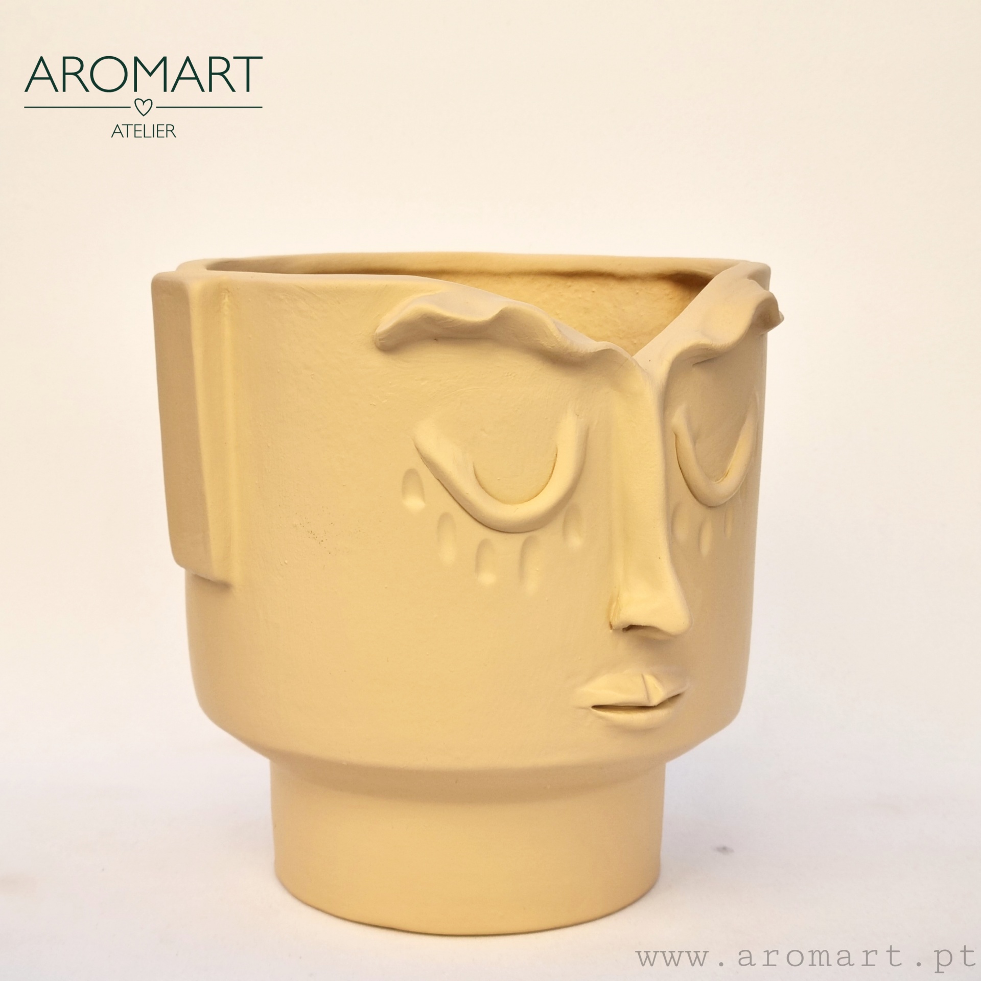 • Vaso cerâmico bege em forma de cabeça com olhos e lábios modelados