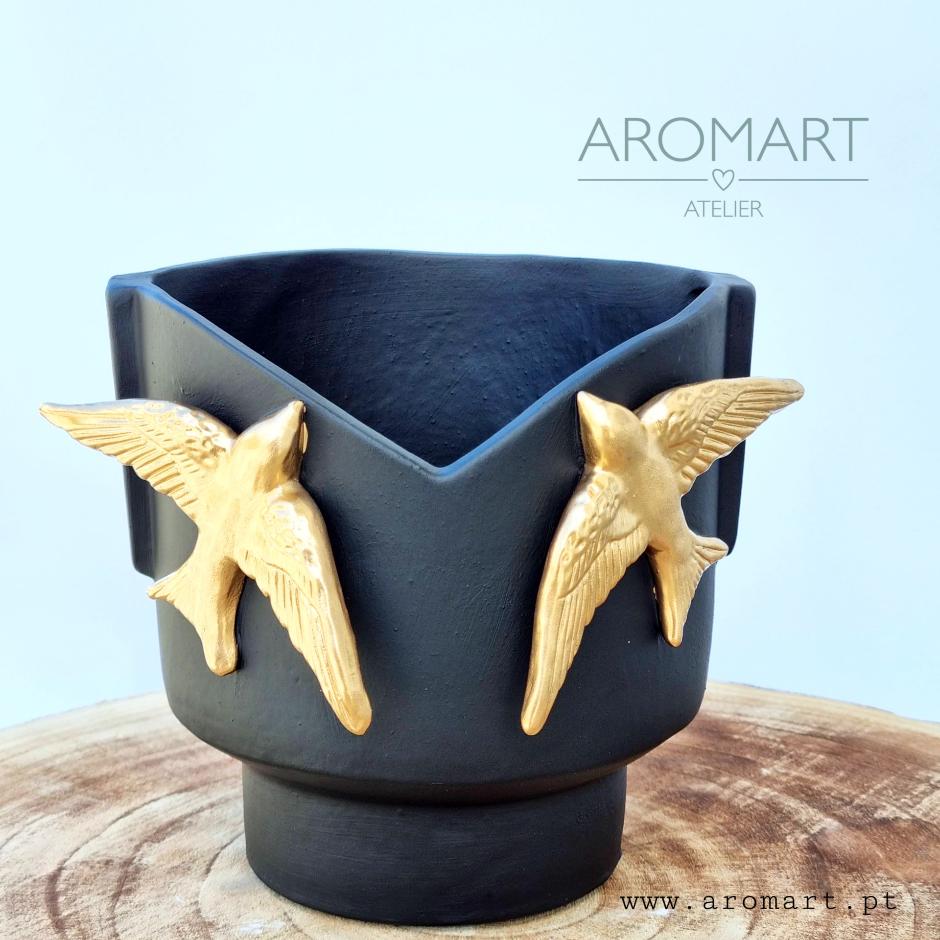 • Vaso preto com pássaros dourados sobre superfície de madeira com texto AROMART ATELIER