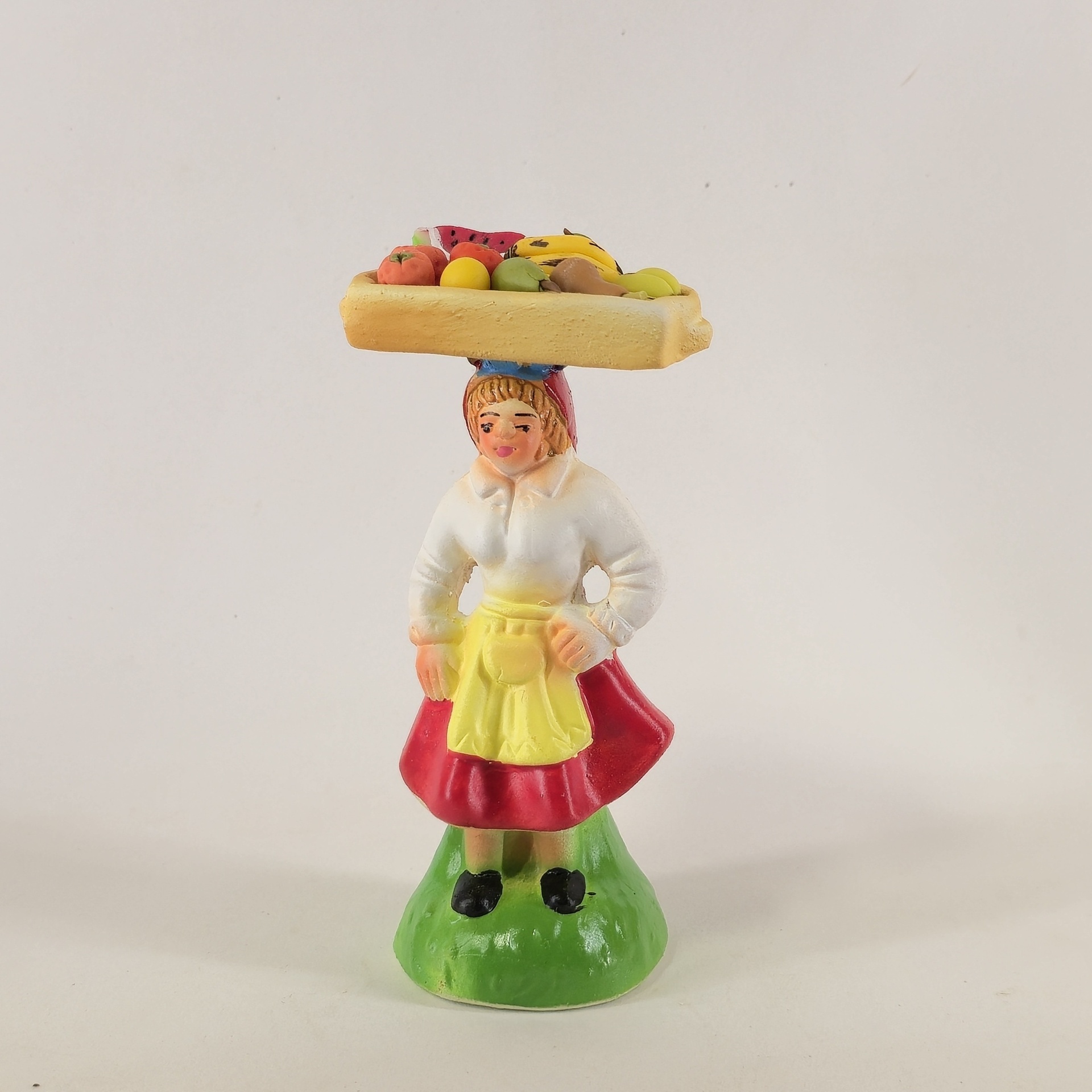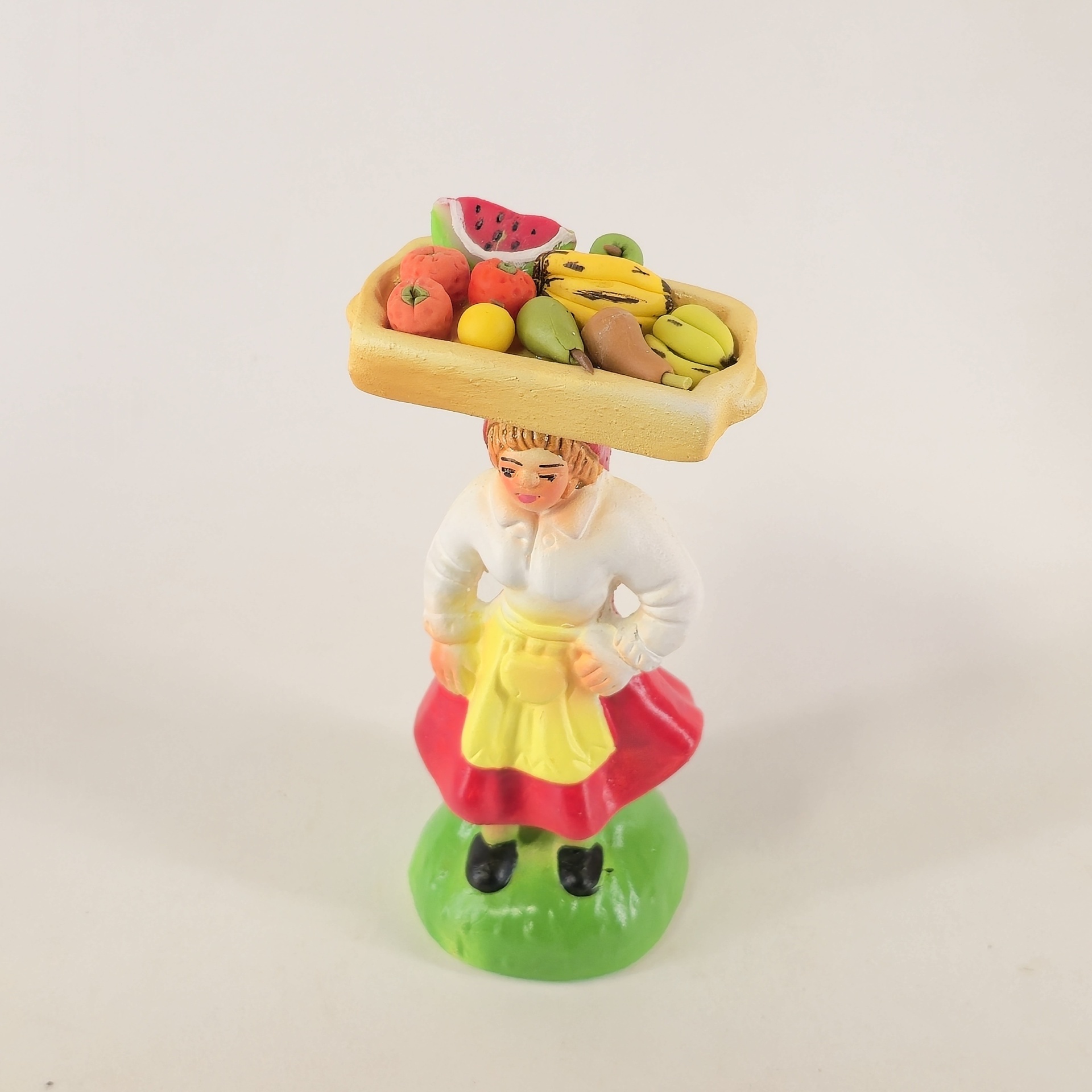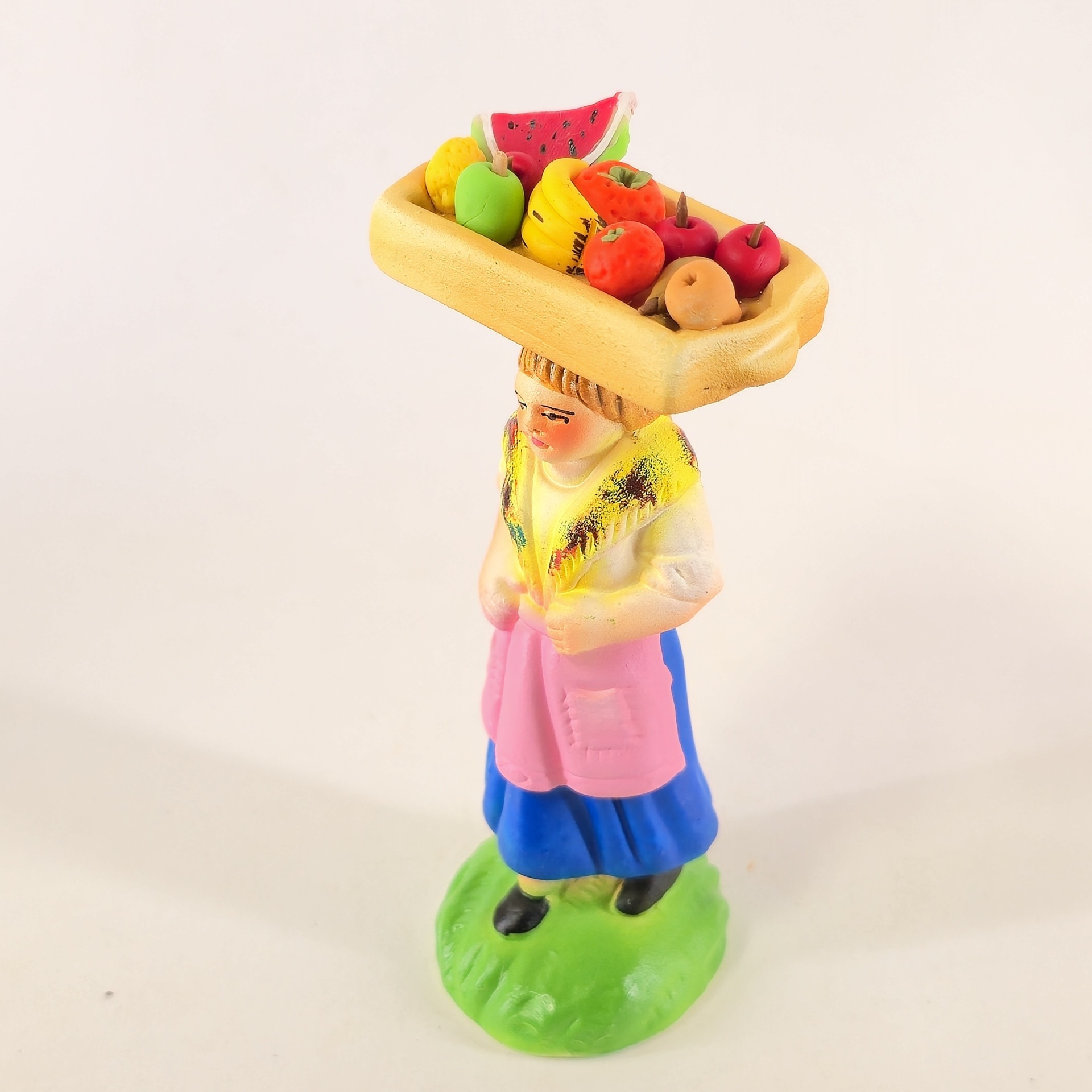 Vendedoras de Fruta no Tabuleiro à Cabeça 20,00 € Desconto de %. IVA incluído. Partilhar Cor da saia Lilás Castanho Vermelho Azul Comprar Contactar 1 unidades em stock Figura da mulher a vender fruta no tabuleiro que leva à cabeca, em cerâmica, ideal para completar a sua cascata de S. João. ----- (peças em cerâmica feitas de forma artesanal e pintadas à mão) ----- As peças em cerâmica, certificadas, são da autoria do Artesão João Macedo de Barcelos. Medidas: aproximadamente 14cm de altura. Ref. Interna: 296/B NOTA: a fruta é feita em biscuit Marca Figuras do Barro® Tags cascatacascata de sao joaopresepio artesanalpresepio de barropresepio de ceramicahandmadeceramicceramicaceramicartClaymulherbancamulher a vender na bancamulher com bancavendedoraVendedora de frutafrutaFrutosMaçãsPêrasBananasLimõesMelânciasKiwi Características