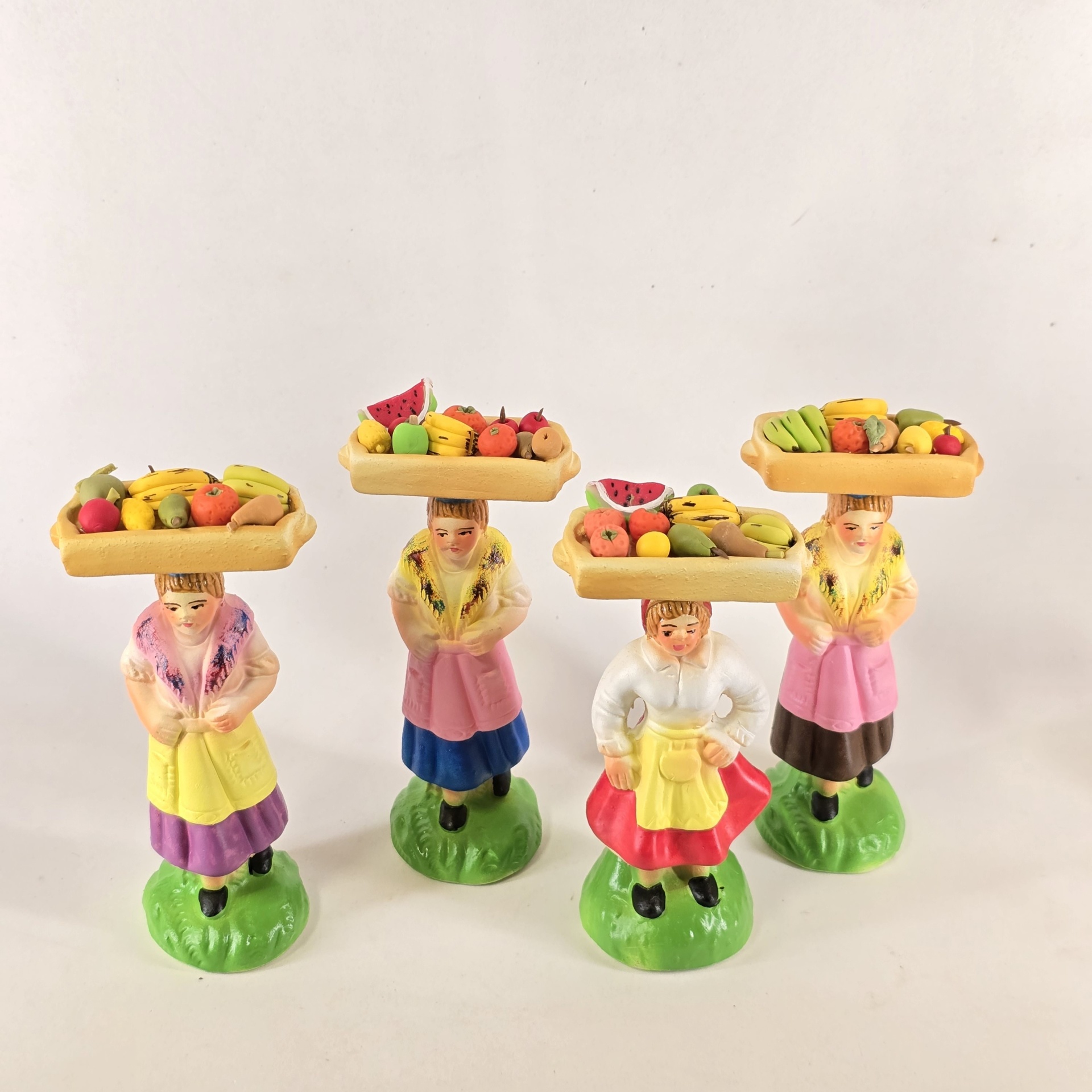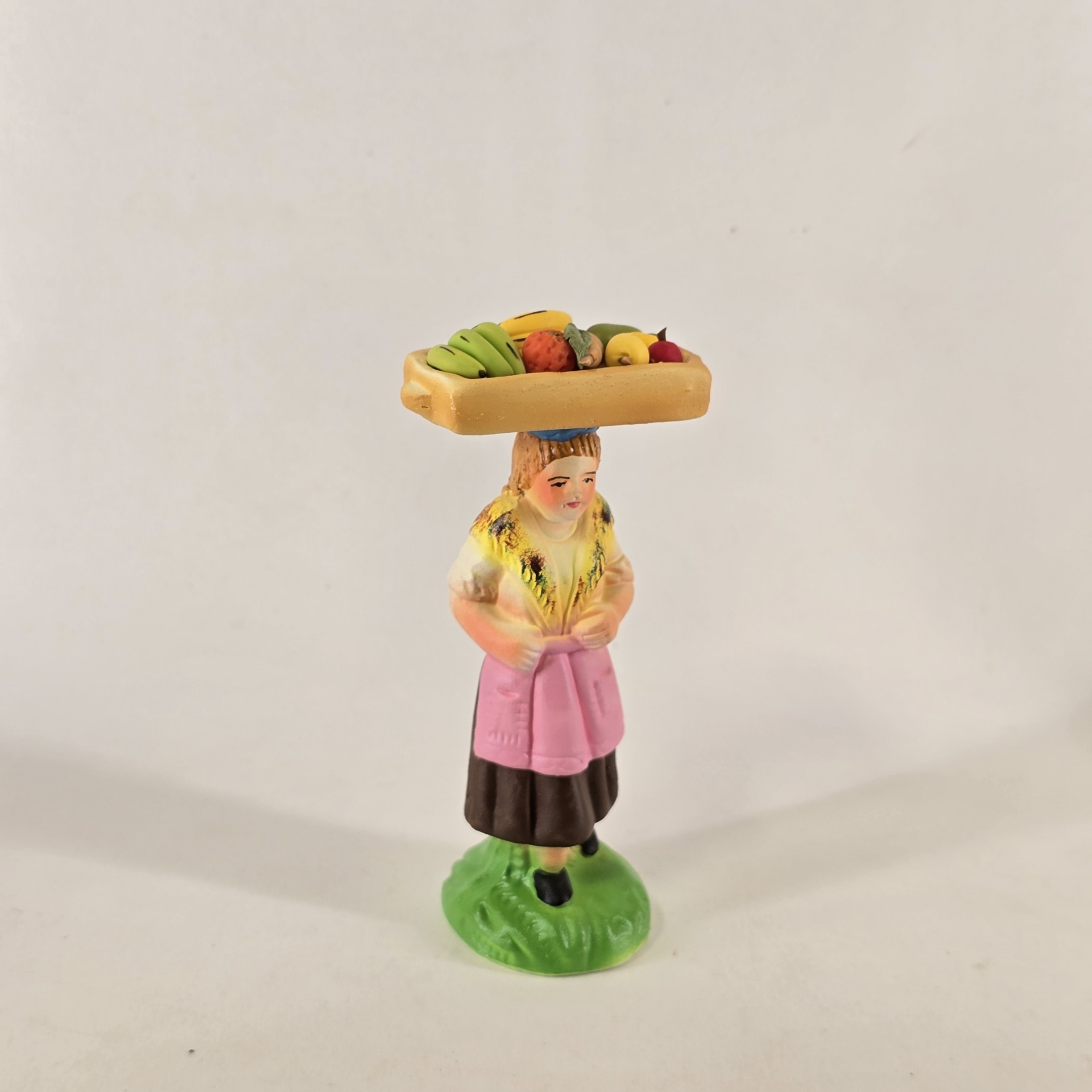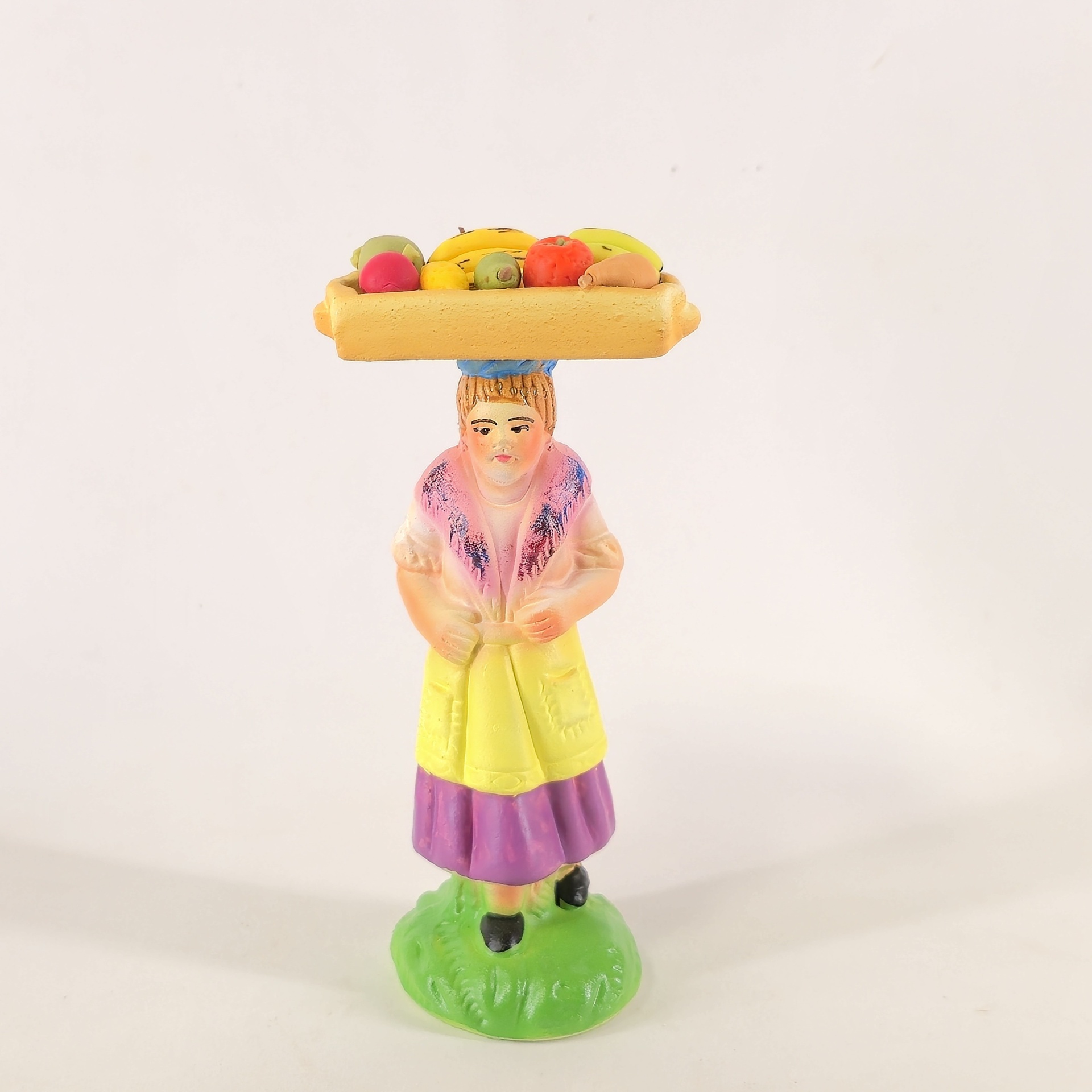 Vendedoras de Fruta no Tabuleiro à Cabeça 20,00 € Desconto de %. IVA incluído. Partilhar Cor da saia Lilás Castanho Vermelho Azul Comprar Contactar 1 unidades em stock Figura da mulher a vender fruta no tabuleiro que leva à cabeca, em cerâmica, ideal para completar a sua cascata de S. João. ----- (peças em cerâmica feitas de forma artesanal e pintadas à mão) ----- As peças em cerâmica, certificadas, são da autoria do Artesão João Macedo de Barcelos. Medidas: aproximadamente 14cm de altura. Ref. Interna: 296/B NOTA: a fruta é feita em biscuit Marca Figuras do Barro® Tags cascatacascata de sao joaopresepio artesanalpresepio de barropresepio de ceramicahandmadeceramicceramicaceramicartClaymulherbancamulher a vender na bancamulher com bancavendedoraVendedora de frutafrutaFrutosMaçãsPêrasBananasLimõesMelânciasKiwi Características